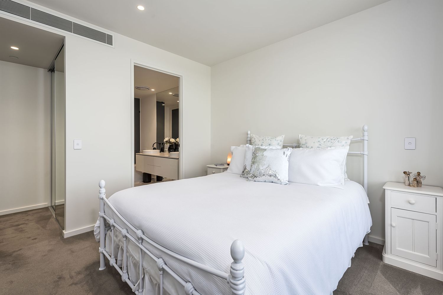 This unit has an impressive open-plan design, with 2 bedrooms plus study and 2 bathrooms. The large kitchen with an island bench looks out through the floor to ceiling double glazed tinted glass which really brings the outside in and provides plenty of light through the living areas. Adjoining the living space through the stacker doors is where this unit really sets itself apart with the 30m2 balcony, meaning there is plenty of room for outdoor dining plus a daybed and bbq area.