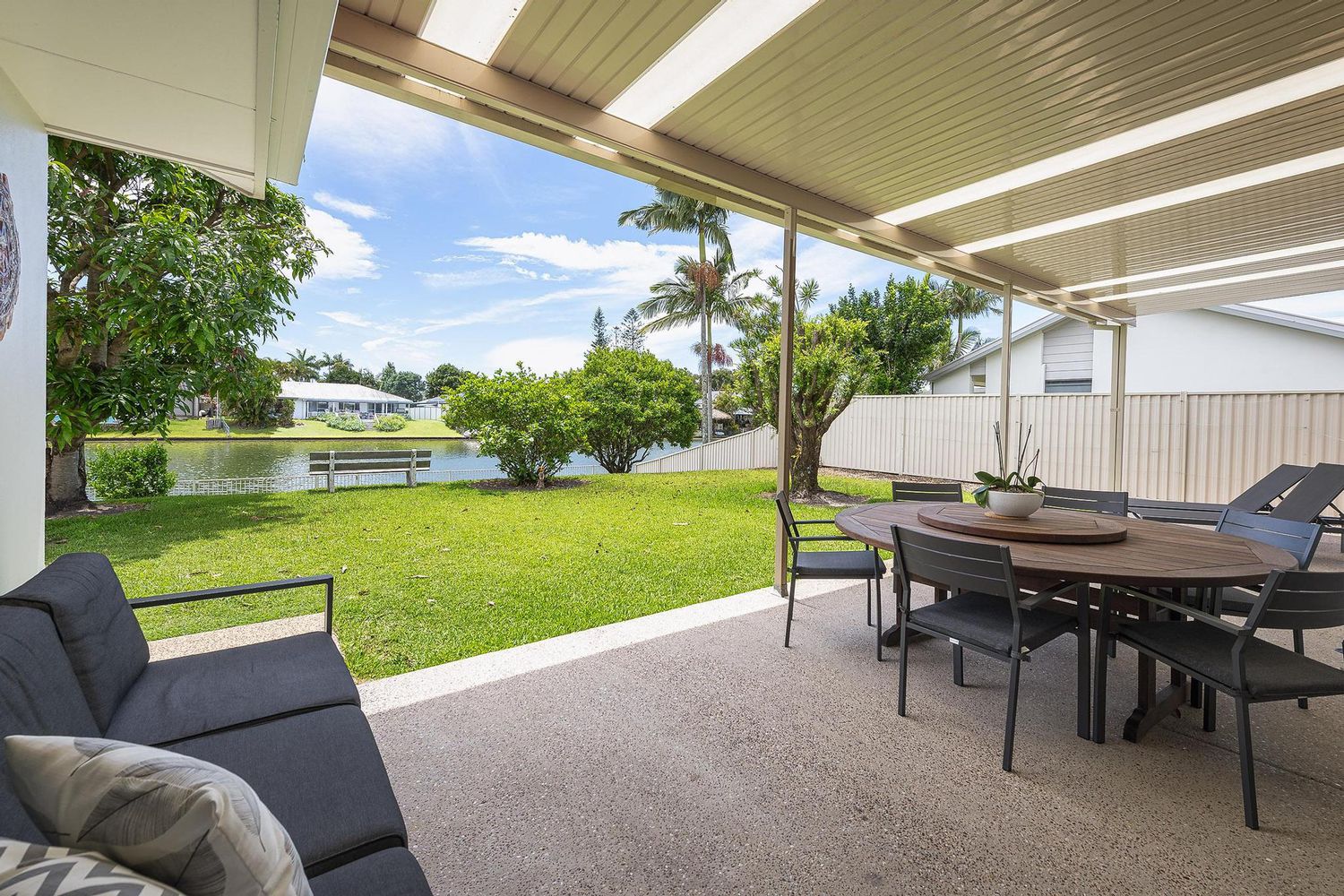 - Overlooking the water, the backyard is perfect for morning coffee, evening sunsets, or entertaining friends and family.