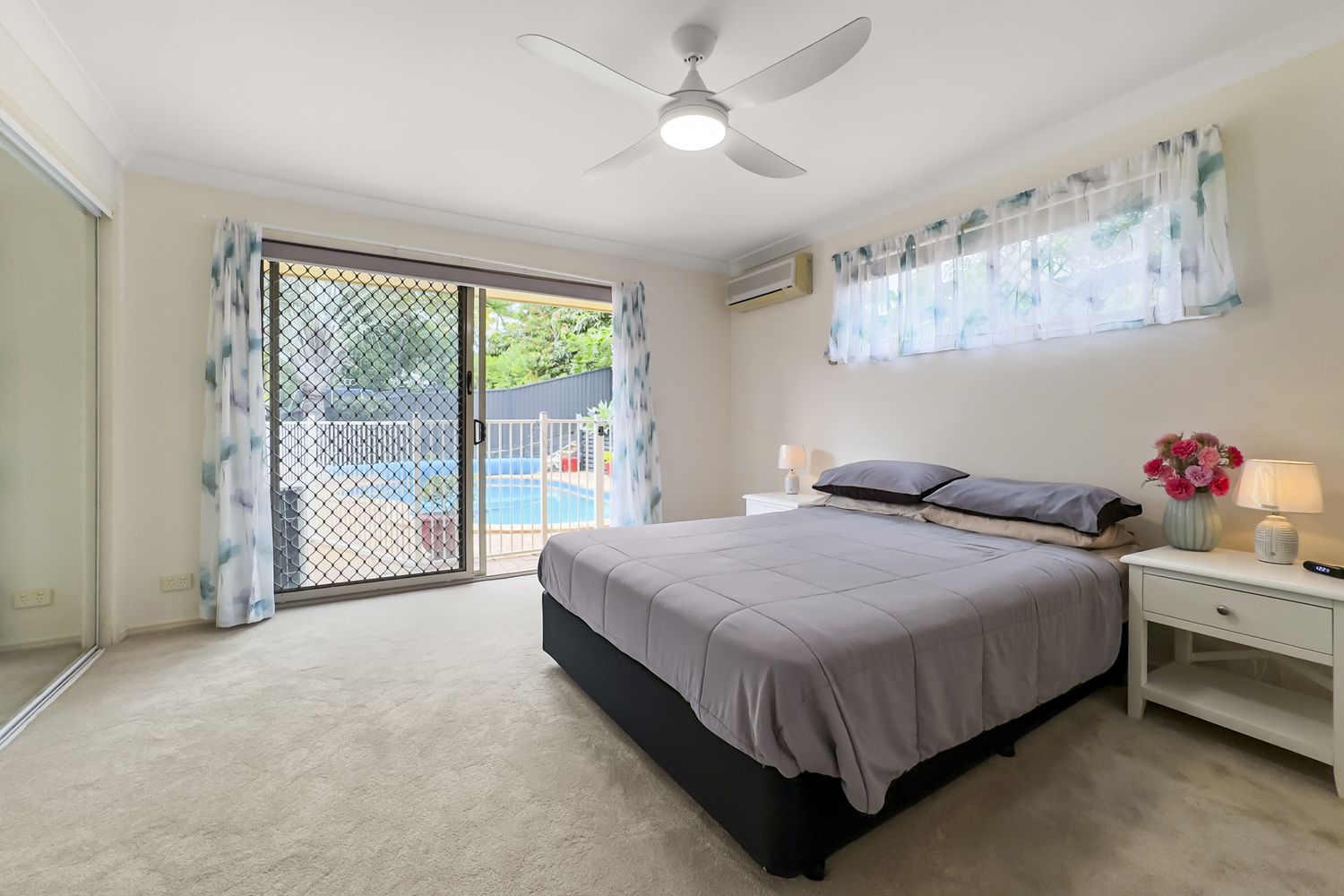 Master suite with built-in mirrored robes, air conditioning, ceiling fan, and private ensuite with double vanity, shower, toilet and heat/light/fan (Tastic); positioned to overlook the pool