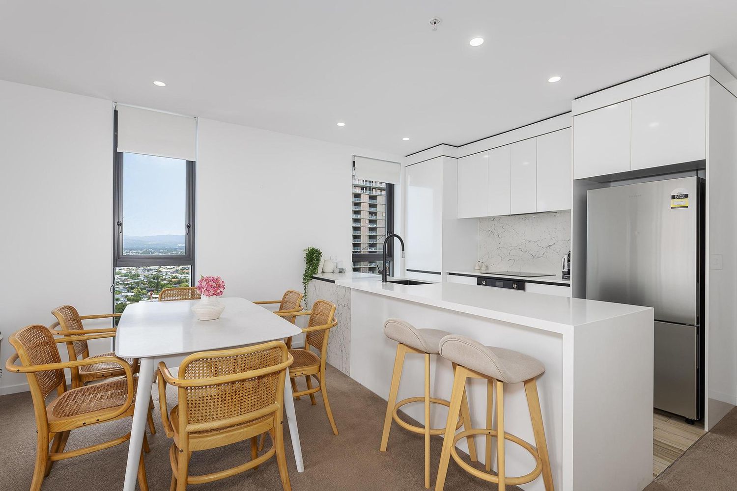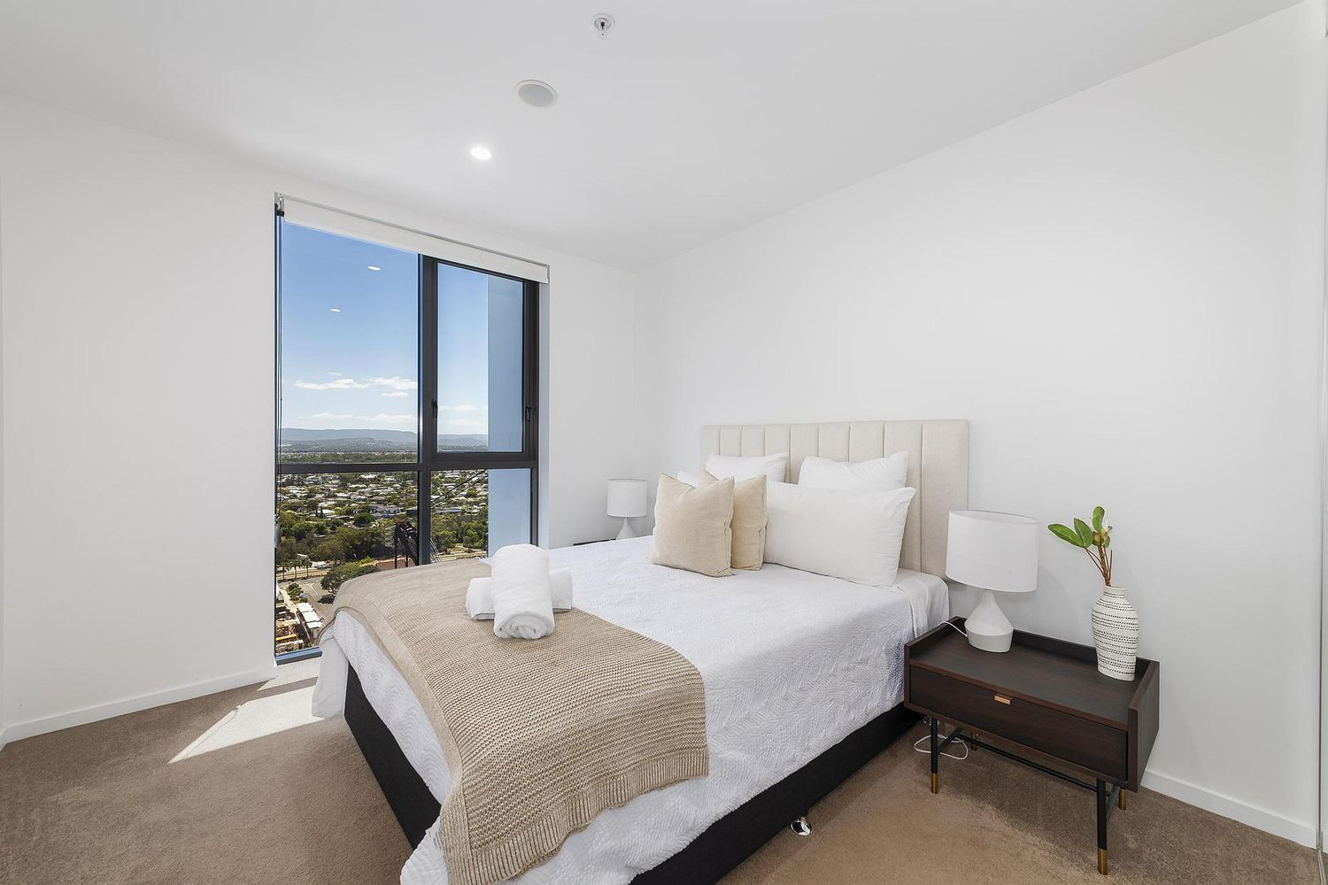 Designed for those who value space, light and understated luxury, the residence opens to expansive glazing that captures sweeping ocean, skyline and hinterland views. The open-plan living environment extends effortlessly to a private entertainer’s balcony — a serene setting for both sunrise mornings and evening entertaining.