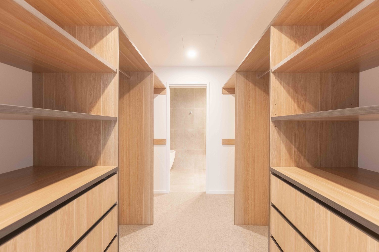 Engineered stone benchtops with natural oak detailing
