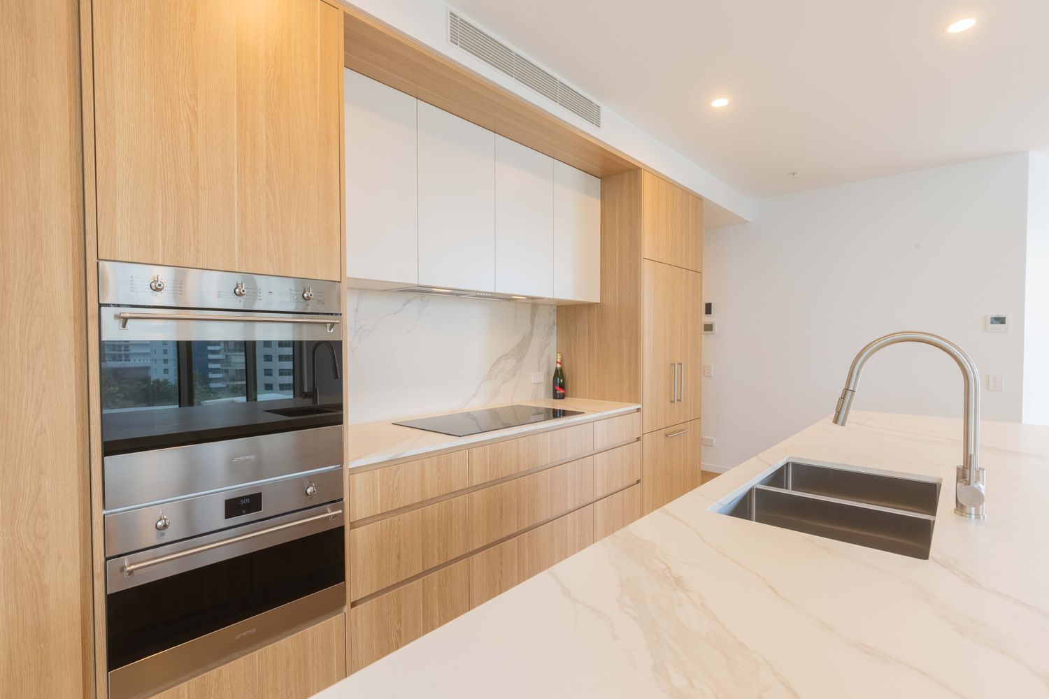 Premium Smeg appliances including induction cooktop, oven, integrated dishwasher and integrated double door fridge.