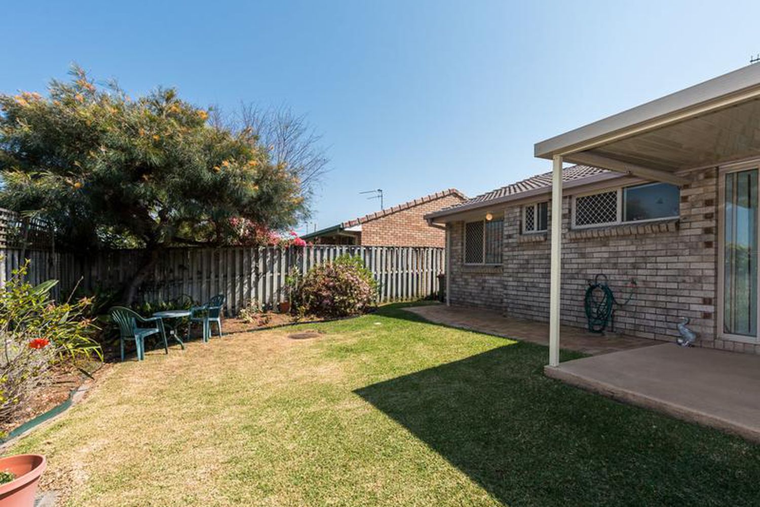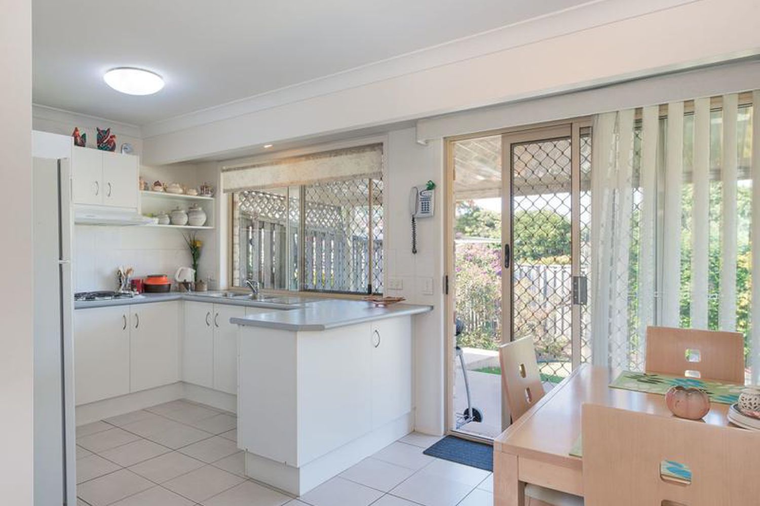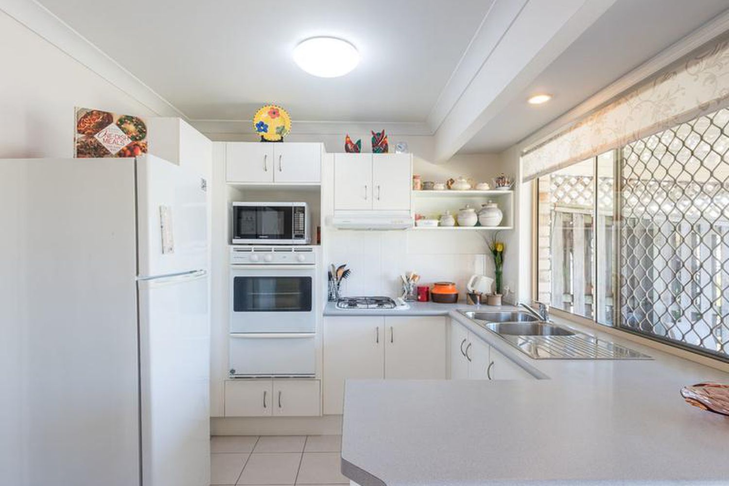The fully tiled living is light and bright and captures cooling water breezes from a nearby lake system. An adjoining meals area overlooks a pretty garden with a green lawn and flowering plants. Featuring gas cooking the kitchen has plenty of cupboard space including a pantry.